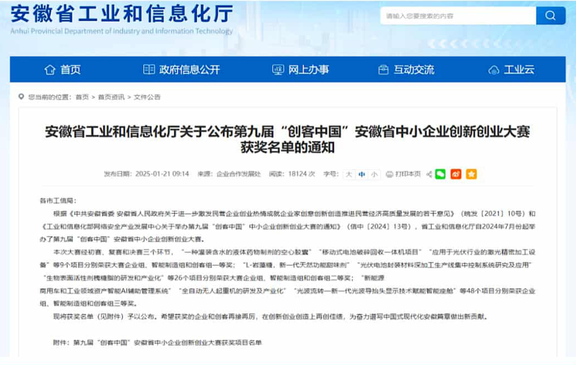 • 評定為2023年度國家知識產權優勢企業 入選2023年安徽省技術創新示范企業名單
